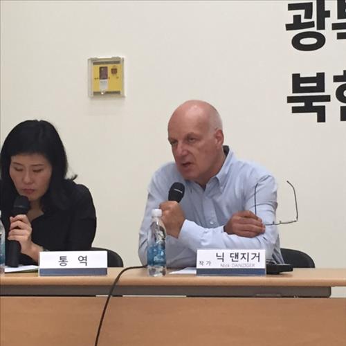 | △ (서울=연합뉴스) 김정선 기자 = 21일 서울시립미술관에서 열린 북한 프로젝트 기자 간담회에 참석한 닉 댄지거(오른쪽). |