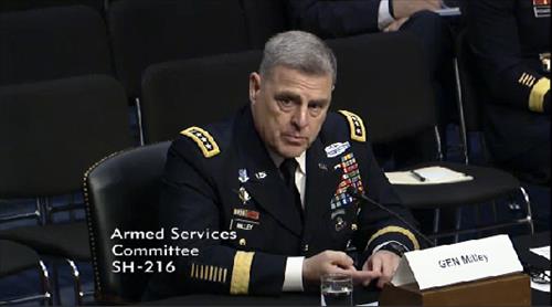 | △ 마크 밀레이 미국 육군 참모총장 내정자가 상원 군사위원회 청문회에서 증언하고 있다. |