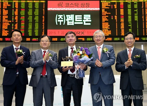 | △ 펩트론 코스닥시장 신규상장기념식 (서울=연합뉴스) 한국거래소 코스닥시장본부는 22일 오전 서울사옥 홍보관에서 (주)펩트론의 코스닥시장 신규상장기념식을 개최했다. 상장기념패 전달 후 강홍기 한국IR협의회 부회장(왼쪽부터), 김재준 한국거래소 코스닥시장위원회 위원장, 최호일 (주)펩트론 대표이사, 정영채 NH투자증권 IB대표, 김원식 코스닥협회 부회장이 기념촬영을 하고 있다. 2015.7.22 << 한국거래소 제공 >> photo@yna.co.kr |