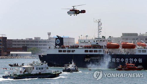 | △ 국제여객선(해양수산연수원 실습선)이 침몰하는 상황을 가정해 인명을 구조하는 '2015 재난대응 안전한국훈련'. 훈련에는 해경함정, 해경고속단정, 해군함정 등이 동원됐다. (연합뉴스 자료사진) |