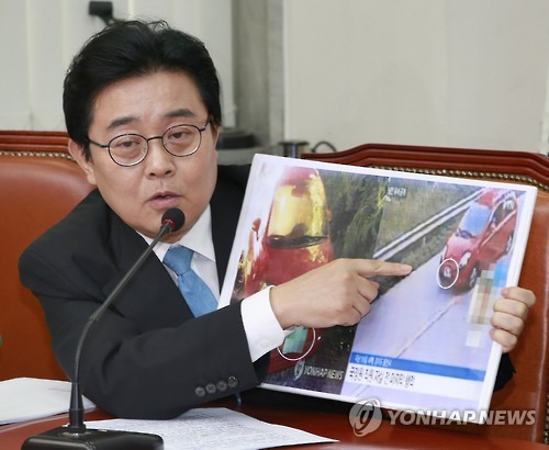| △ '번호판 색상이 달라요' (서울=연합뉴스) 이상학 기자 = 새정치민주연합 전병헌 최고위원이 22일 국회에서 열린 최고위원회의에서 최근 자살한 국정원 직원의 마티즈 차량 번호판 색상과 도로 CCTV에 촬영된 차량의 번호판 색상이 다르다고 주장하고 있다. |