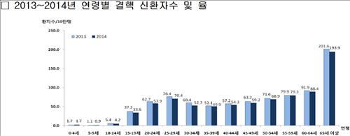 작년 신환자율은 전년의 71.4명에 비해 3.8% 줄어든 것이다. 신환자율은 모든 연령대에서 감소했으며 특히 10~14세(21.8% 감소), 30~34세(12.8% 감소)에서 감소폭이 컸다.