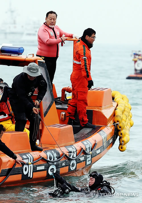 | △ 지난해 세월호 침몰 현장에서 잠수수색에 참여한 UDT 출신이자 배우인 정동남(왼쪽 위)씨의 모습. (연합뉴스 자료사진) |
