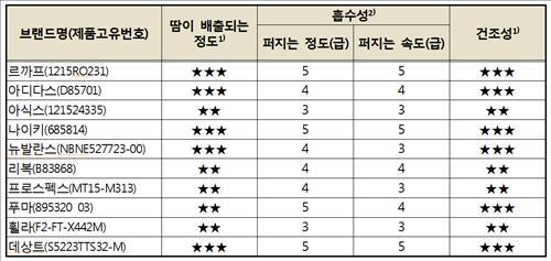 젖은 상태에서 완전히 건조될 때까지의 성능인 건조성은 아식스, 리복, 프로스펙스, 휠라의 4개 제품이 상대적으로 좋지 않았다.