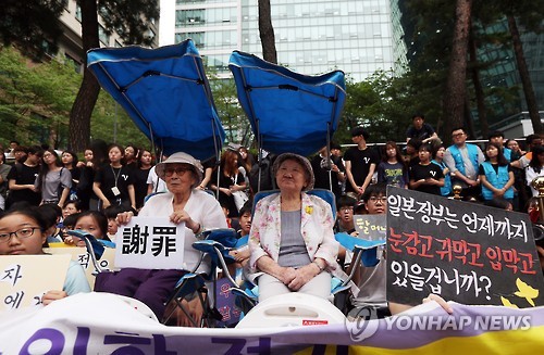 | △ 수요집회 참석한 할머니들 (서울=연합뉴스) 신준희 기자 = 22일 오후 서울 종로구 주한일본대사관 앞에서 김복동(왼쪽), 길원옥 할머니가 참석한 가운데 일본군 위안부 피해자 문제 해결을 위한 수요집회가 열리고 있다. |