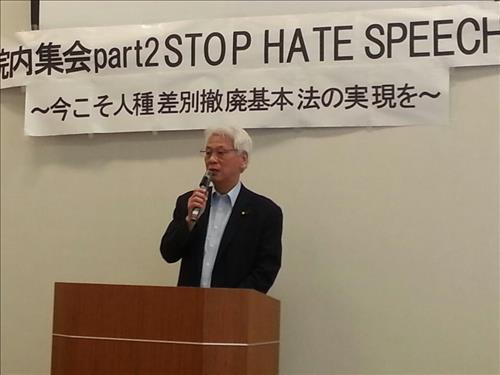 '인종 등을 이유로 하는 차별 철폐를 위한 시책 추진에 관한 법률안(이하 차별철폐법안)'의 공동 제출자 중 한 명인 오가와 도시오(小川敏夫) 참의원 의원(민주당)은 22일 도쿄 참의원 의원회관에서 열린 헤이트스피치 반대 집회에서 "법안이 참의원 운영위원회에서 법무위원회로 위탁됐지만 이례적이게도 위탁된 채 심의는 시작하지 않는 상황"이라고 말했다.