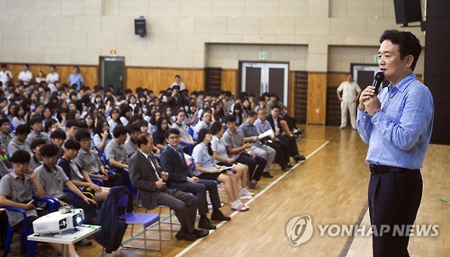 | △ 남경필 경기도지사, 화성 예당고 특강 (수원=연합뉴스) 남경필 경기도지사가 22일 오후 화성의 예당고등학교를 방문, 학생과 교사 등 800여명에게 특강을 하고 있다.(경기도 제공) |