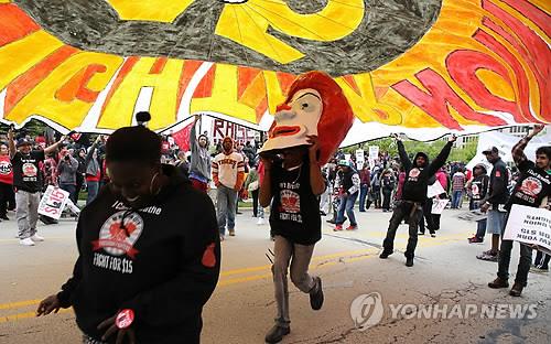 | △ 지난 5월 맥도날드 주주총회를 앞두고 시카고의 맥도날드 본사 앞에서 시간당 최저 임금 15달러를 요구하며 시위하는 모습. |