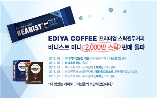(서울=연합뉴스) 전준상 기자 = 커피브랜드 이디야커피는 스틱원두커피인 '비니스트 미니' 판매가 2천만 스틱을 돌파했다고 23일 밝혔다.