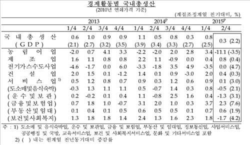 전승철 한국은행 경제통계국장은 "농림어업의 생산감소가 성장률을 0.2%포인트 낮춘 것으로 추산될 만큼 2분기엔 가뭄과 메르스로 인한 타격이 컸다"고 설명했다.