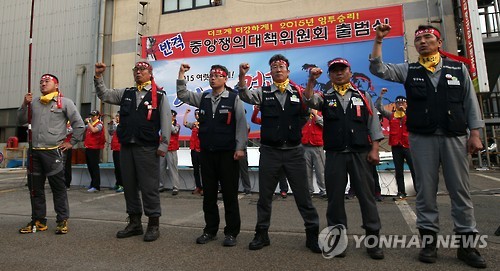 | △ 현대중공업 노조 쟁대위 출범식 (울산=연합뉴스) 김용태 기자 = 현대중공업 노조가 15일 오후 울산시 동구 현대중공업 본사에서 중앙쟁위대책위원회 출범식을 개최한 가운데 정병모 노조위원장(왼쪽 두번째) 등 노조 관계자들이 구호를 외치고 있다. 2015.7.15 yongtae@yna.co.kr |