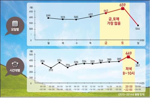 2010년부터 2014년까지 7∼8월 교통사고 사망자 가운데 금요일은 642명, 토요일은 659명을 기록했다.