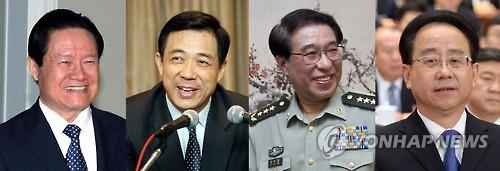 | △ 시진핑 체제가 처벌한 대표적 부패 공직자들인 저우융캉 전 정치국 상무위원(무기징역, 왼쪽), 보시라이 전 충칭시 당서기(무기징역, 왼쪽 두번째), 쉬차이허우 전 중앙군사위 부주석(사망, 왼쪽 세번째), 링지화 전 통일전선공작부장. '부패 신4인방'인 이들 대부분은 재판과정에서 여성들과 부적절한 관계를 가진 사실이 들통났다. 특히 저우융캉, 링지화의 혐의에는 다수 여성들과의 간통 혐의가 포함됐다. |