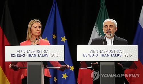 | △ 지난 14일 오스트리아 빈에서 이란 핵협상 타결을 발표하는 페데리카 모게리니(왼쪽) 유럽연합(EU) 외교안보 고위대표와 모하마드 자바드 자리프 이란 외무장관.(AP=연합뉴스) |