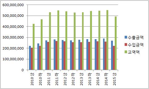 <그래프> 반기별 수출입 금액 추이(단위 :천달러/자료= 관세청)