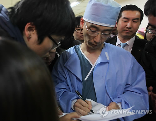 | △ 지난 2011년 경기도 수원 아주대학교 병원에서 '아덴만 여명작전'으로 총상을 입고 치료 중인 석해균 삼호주얼리호 선장의 총상 부위에 대해 이국종 교수가 설명하고 있다. (연합뉴스 자료사진) |