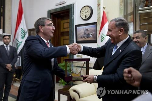 (바그다드 AFP=연합뉴스) 애슈턴 카터 미국 국방장관이 23일(현지시간) 이라크를 찾아 이라크군의 이슬람국가(IS) 격퇴 작전에 대한 지원을 늘리겠다고 밝혔다.