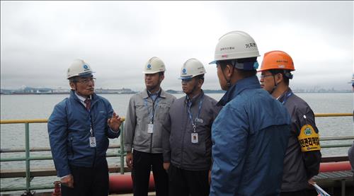 | △ 이승훈 가스공사 사장(맨 왼쪽)이 24일 평택생산기지를 방문, 직원들에게 태풍 피해 예방에 만전을 기할 것을 당부하고 있다. |