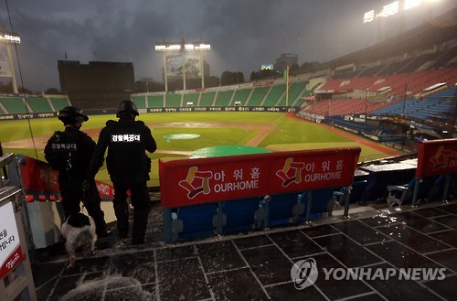 | △ 야구장에 폭발물 신고 접수 (서울=연합뉴스) 박동주 기자 = 23일 프로야구 LG 트윈스와 넥센 히어로즈의 경기가 열린 서울 잠실구장에 폭발물 설치 신고가 들어와 경찰특공대원 등이 수색을 하고 있다. 2015.7.23 pdj6635@yna.co.kr |