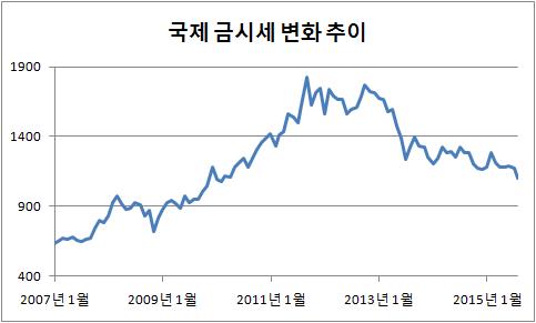 2006년 3월만 해도 1트로이온스당 534달러였던 국제금값은 이후 가파르게 오르기 시작, 2011년 9월에는 온스당 1천900달러까지 오르기도 했다.