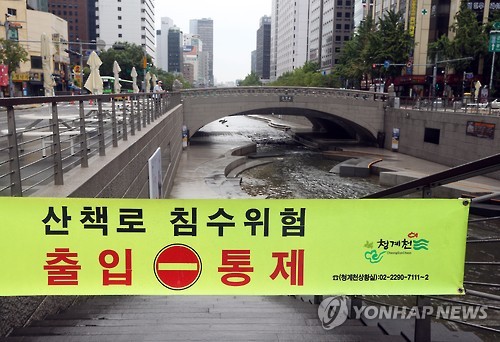 | △ 청계천 산책로 통제 (서울=연합뉴스) 신준희 기자 = 전국에 장맛비가 내린 26일 오전 서울 청계천 산책로가 침수위험으로 통제되고 있다. hama@yna.co.kr |