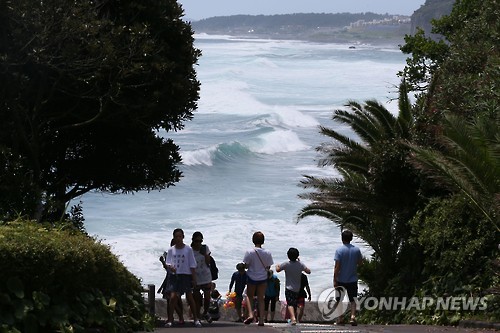 | △ 중문 해변 입욕 통제 (서귀포=연합뉴스) 박지호 기자 = 북상 중인 제12호 태풍 '할롤라(HALOLA)'의 영향으로 26일 제주 서귀포 중문해수욕장에 입욕통제령이 내려진 가운데 이날 오후 해변을 찾은 관광객들이 평소보다 높아진 파도를 구경하고 있다. |