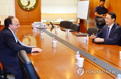 | △ 한·미 북핵 6자회담 차석대표 면담 (서울=연합뉴스) 이정훈 기자 = 김건 외교부 북핵외교기획단장과 시드니 사일러 미 국무부 북핵 특사가 27일 오후 서울 종로구 도렴동 외교부에서 면담하고 있다. uwg806@yna.co.kr |