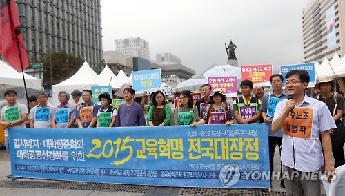 | △ 2015 교육혁명 전국대장정 (서울=연합뉴스) 신준희 기자 = 27일 오전 서울 광화문광장에서 전교조 등 주최로 '입시폐지, 대학 평준화와 대학공공성 강화를 위한 2015 교육혁명 전국대장정' 출발 기자회견이 열리고 있다. |