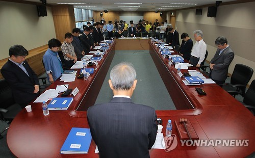 | △ 묵념하는 세월호 특별조사위 (서울=연합뉴스) 이정훈 기자 = 이석태 세월호 특조위원장과 위원들이 27일 서울 중구 저동 세월호참사 특별조사위원회에서 열린 10차 회의에서 묵념하고 있다. |