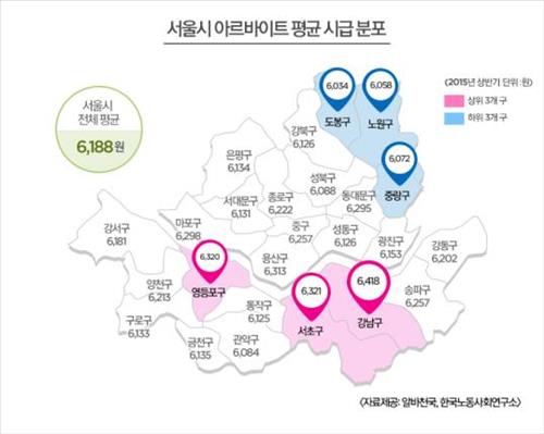 (서울=연합뉴스) 김연숙 기자 = 서울 시내 아르바이트 평균 시급은 6천188원이고 강남과 강북의 차이가 최대 약 400원에 이르는 것으로 나타났다.