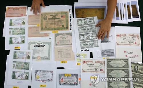 | △ "예금만 1조원 있다" 재력가 행세한 대출사기꾼 구속 (서울=연합뉴스) 한종찬 기자 = 거액이 든 위조통장과 가짜 화폐로 수조원대 재력가 행세를 하며 자금사정이 어려운 영세 건설시행업자들에게 대출사기 행각을 벌인 50대가 붙잡혔다. 서울 서초경찰서는 이같은 방식으로 대출을 약속하고는 대출 수수료만 받아 챙긴 혐의(사기)로 김모(55)씨를 구속했다고 28일 밝혔다. 사진은 이날 서초경찰서가 공개한 위조 통장과 가짜 화폐 사본들. 2015.7.28 saba@yna.co.kr |