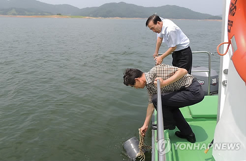 | △ (청주=연합뉴스) 대청호 회남 수역에 29일 조류주의보가 내려졌다. 사진은 2003년 7월 대청호 추동수역에서 대청댐관리단 직원들이 수질을 점검하는 모습. <<연합뉴스 DB>> |