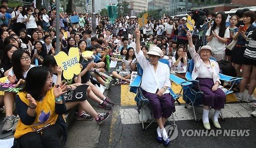 | △ (서울=연합뉴스) 한종찬 기자 = 29일 오후 서울 종로구 주한일본대사관 앞에서 열린 일본군 위안부 문제 해결을 위한 제1189차 정기 수요집회에서 길원옥(오른쪽), 김복동 할머니(오른쪽 두번째)가 참가자들에게 인사를 하고 있다. 2015.7.29 |