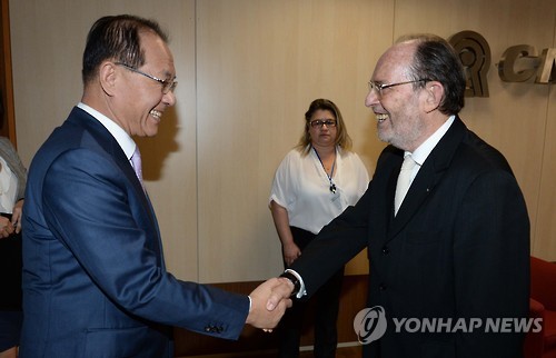 | △ 황 부총리, 구날릭 브라질 국가과학기술위원장 면담 (세종=연합뉴스) 중남미를 방문중인 황우여 부총리 겸 교육부 장관이 28일(현지시간) 첫 방문지인 브라질 브라질리아에서 에르난 차이모비치 구날릭 브라질 국가과학기술위원회(CNPq) 위원장과 만나 교육·연구 등 상호협력방안을 논의하기 앞서 악수하고 있다. 이날 한국과 브라질은 교육문화분야 교류 확대를 논의하는 공동위원회를 구성하기로 합의하고 양국간 유학생 교류를 확대하기로 했다. (교육부 제공) |