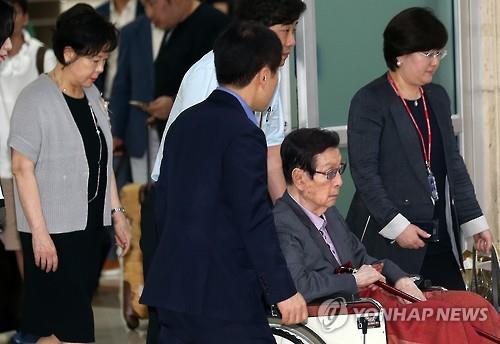 | △ (서울=연합뉴스) 신준희 기자 = 신격호 롯데그룹 총괄회장의 장녀인 롯데복지재단 신영자 이사장(맨 왼쪽)이 28일 오후 휠체어에 탄 신 총괄회장과 함께 김포국제공항을 통해 귀국하고 있다. 2015.7.29 |