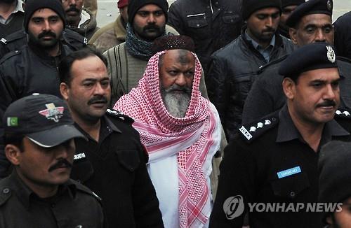 | △ 2014년 12월 파키스탄 라호르 고등법원에 출석하는 마리크 이샤크(가운데) 라슈카르-에-장비 지도자(AFP=연합뉴스) |