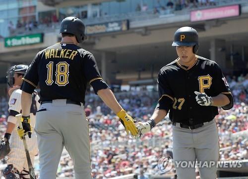 | △ 강정호(28.피츠버그 파이리츠)가 29일(현지시간) 미네소타 트윈스와의 방문경기에서 2회 선제 솔로 홈런을 친 뒤 후속 타자 닐 워커의 축하를 받고 있다. (AFP=연합뉴스) |