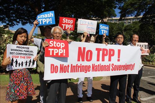 (마우이<하와이>=연합뉴스) 심인성 특파원 = 미국 하와이 마우이 섬에서 진행되는 환태평양경제동반자협정(TPP) 협상 당사국 간 각료회의가 29일(현지시간) 이틀째로 접어든 가운데, 협상장 밖에서는 일본 시민단체들의 TPP 반대 시위가 열렸다.