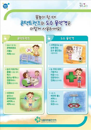 (서울=연합뉴스) 김예나 기자 = 식품의약품안전처는 여름 휴가철 물놀이를 할 때 착용하는 콘텍트렌즈 및 도수 물안경의 올바른 사용법을 담은 리플릿을 제작해 배포한다고 30일 밝혔다.