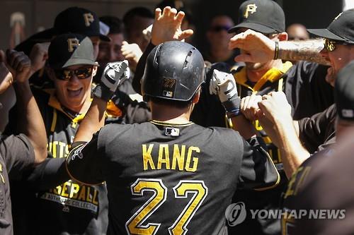 | △ (미니애폴리스 AP=연합뉴스) 강정호가 30일(한국시간) 미국 미네소타 주 미니애폴리스의 타깃필드에서 벌어진 미네소타 트윈스와 메이저리그 방문 경기에서 솔로 아치를 그린 후 동료의 축하를 받고 있다. |