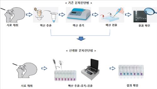 경북대 사업단이 개발한 신 분자진단 검사법은 분자진단 검사과정의 핵산 추출-증폭-검출 단계를 검사 대상별 시약과 소형화된 장비를 활용해 1단계로 단축한 것으로 검사 시간은 30분 정도로 대폭 줄어들었다.