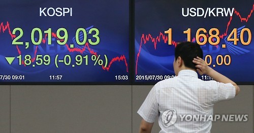 | △ 코스피, 국내 기업 실적 부진에 '하락' (서울=연합뉴스) 한종찬 기자 = 코스피가 30일 대형주의 2분기 실적 부진 여파로 약세 흐름을 보였다. 코스닥도 '거품' 우려 속에 닷새 연속 조정을 받으며 710선까지 밀려났다. 이날 코스피는 18.59포인트(0.91%) 내린 2,019.03으로 장을 종료했다. 코스닥지수는 17.61포인트(2.41%) 급락한 712.86으로 마감했다. 서울 외환시장에서 원·달러 환율 종가는 달러당 1,168.4원으로, 전일 종가보다 10.0원 올랐다. 사진은 이날 오후 서울 외환은행 본점 딜링룸. |