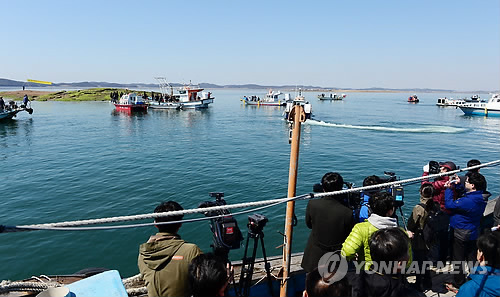 | △ 홍성·태안군 해상경계 분쟁 현장검증 (홍성=연합뉴스) 헌법재판소 관계자들이 24일 충남 태안군과 홍성군 간 해상경계를 두고 갈등을 빚는 죽도 주변 해역을 각 지자체의 안내를 받으며 둘러보고 있다. 2015.3.24 << 홍성군 >> kjunho@yna.co.kr |