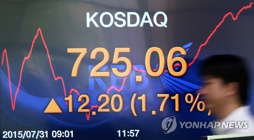 31일 코스닥지수는 전날보다 12.20포인트(1.71%) 오른 725.06으로 마감했다.
