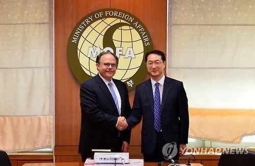 | △ 김건 외교부 북핵외교기획단장과 시드니 사일러 미 국무부 북핵 특사가 7월 27일 오후 서울 종로구 도렴동 외교부에서 면담 전 악수를 하는 모습(연합뉴스.자료사진) |