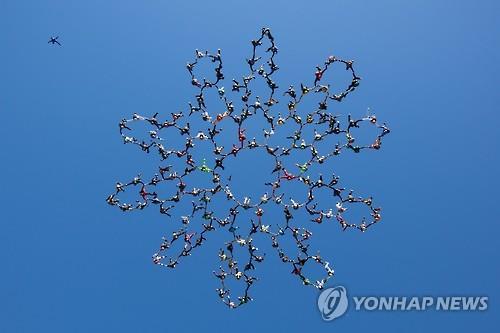 (오타와<미 일리노이주> AP=연합뉴스) 전 세계에서 모인 스카이다이버 164명이 최고 초속 107m로 창공을 가르며 수직 낙하하면서 눈꽃송이 대형을 연출하는 장관을 펼쳤다.