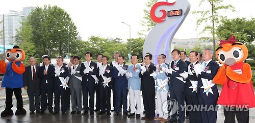 | △ 2015 경북문경 세계군인체육대회 D-70 (서울=연합뉴스) 임헌정 기자 = 24일 서울 용산구 국방컨벤션에서 열린 2015 경북문경 세계군인체육대회 D-70일 기념행사에서 한민구 국방부 장관과 김관용 경북도지사 등 참석자들이 홍보탑 제막식을 한 뒤 기념촬영을 하고 있다. 2015.7.24 kane@yna.co.kr |
