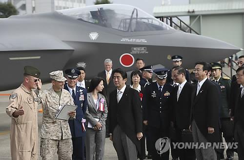 | △ 2014년 10월 26일 일본 이바라키현 햐쿠리(百里) 비행장에서 열린 자위대 창설 60주년 기념행사에서 아베 신조 총리(가운데)가 실물크기의 F35전투기 모형 앞에 서 있는 모습.(AP=연합뉴스 자료사진) |
