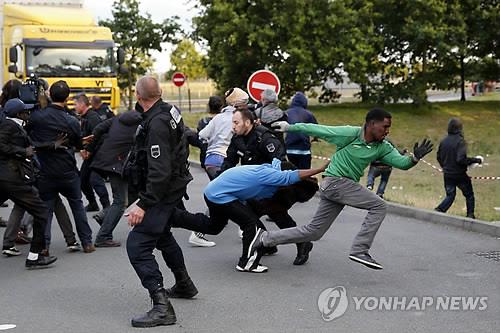 | △ (칼레<프랑스> EPA=연합뉴스) 30일(현지시간) 프랑스 칼레에서 영국으로 가는 기차 탑승을 시도한 난민들이 프랑스 경찰에게 붙잡히고 있다. |