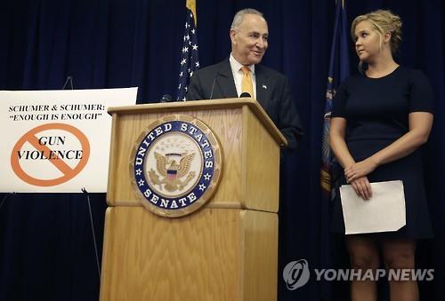 (워싱턴=연합뉴스) 김세진 특파원 = 미국의 대표적인 총기규제론자 정치인인 찰스 슈머(민주·뉴욕) 상원의원이 코미디언 겸 영화배우 에이미 슈머와 나란히 기자회견장에서 서서 총기규제 강화를 주장했다.